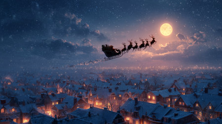 A charming winter scene featuring a sleigh pulled by reindeer soaring over a snowy town under a bright moon. Create holiday magic and joy.