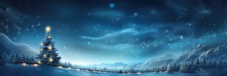 This enchanting image captures a snow-draped Christmas tree standing against a calm, dark blue sky. The striking contrast and serene atmosphere beautifully reflect the spirit of winter and