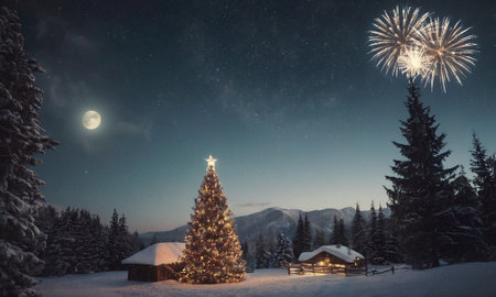 A cozy winter landscape with bright houses in the snow. Glowing Christmas tree and fireworks. High quality illustration