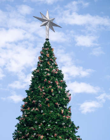 Christmas tree decoration with a silver sky at the very top isolated on cloudy sky