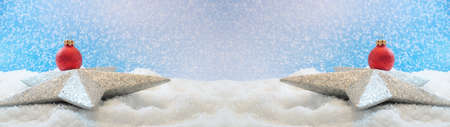 red baubles and star on snow snowflakes - Christmas winter background banner long