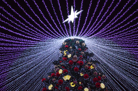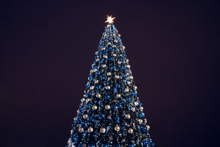 Close up of big Christmas tree with different christmas toys and decorative adornments on street. Coniferous tree with garland, beads and stars to create festive mood during holiday celebration.
