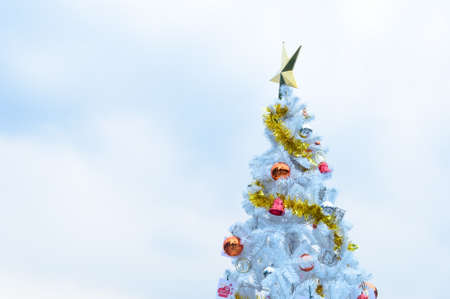 Christmas tree decorated with toys on a blue sky background. copyspace.