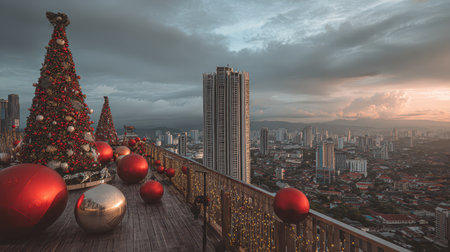 A rooftop adorned with vibrant decor glows at sunset setting a joyful scene for New Year celebrations and a stunning skyline view.