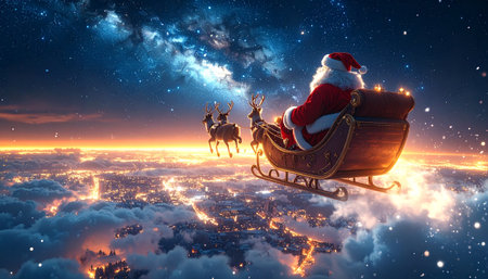 A charming and whimsical scene of Santa Claus in his decorated sleigh, flying through a star-lit night sky with reindeer, spreading holiday magic and joy during Christmas.