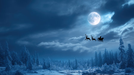 Experience the enchanting beauty of a winter night with Santa's sleigh and reindeer flying under a bright full moon, surrounded by a serene snow-covered landscape.