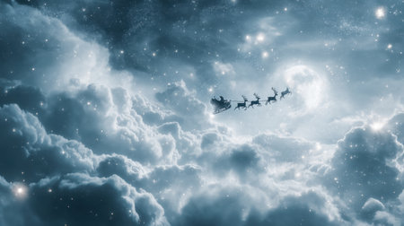 A whimsical night sky showcases a sleigh pulled by reindeer gliding through fluffy clouds, with a glowing moon and twinkling stars creating a magical atmosphere.