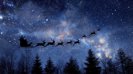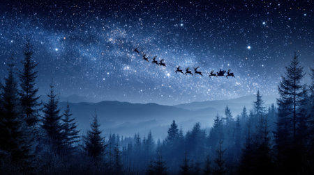 Enchanting scene of Santa Claus riding a sleigh pulled by reindeer through a star-filled night sky, surrounded by dark silhouettes of trees, evoking holiday magic.