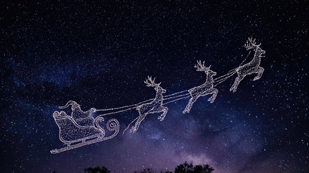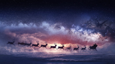 A breathtaking winter scene showcasing a sleigh led by reindeer traversing a starry night sky, creating a magical atmosphere perfect for the holiday season.
