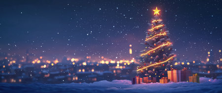 Christmas tree with colorful decorations and gifts on snow against a cityscape at night with falling snow. High quality photo
