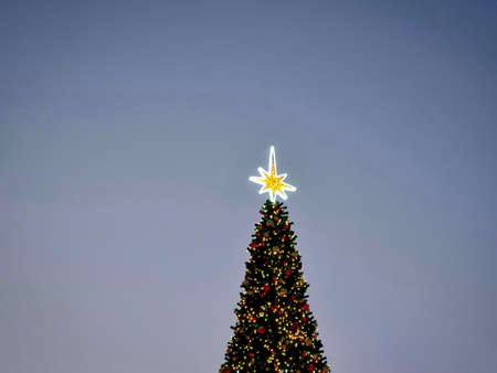 Stylish christmas tree with golden lights and illuminated star on top in european city center. Holiday market in city street. Space for text. Big Christmas tree in downtown in Lviv
