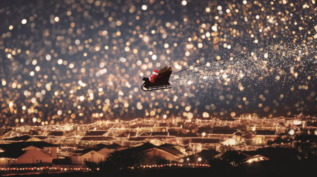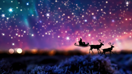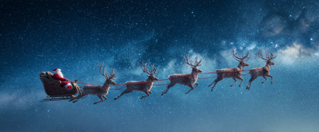 A magical scene depicting Santa Claus in a sleigh pulled by reindeer against a starry night sky. Perfect for holiday themes and winter celebrations.