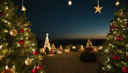 Two decorated Christmas trees with green branches, red and gold ornaments, and warm white lights are prominent in the foreground. In the background, several more illuminated Christmas trees and star-shaped lights are visible against a dark blue twilight sky. The setting appears to be outdoors, possibly a sandy area near the sea.