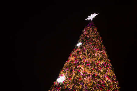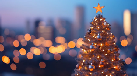 Christmas tree and city lights bokeh background. Merry Christmas and Happy New Year