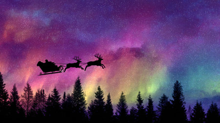 A stunning scene depicts a sleigh pulled by reindeer against a mesmerizing starry sky illuminated by the aurora borealis, evoking winter magic.