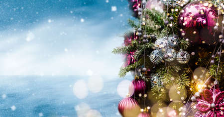 Magically decorated Christmas Tree with balls, ribbons and garlands on a blurred blue shiny, fairy and sparkling background.