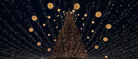 Christmas tree under blue sky. Bottom view of festively decorated tree. New years winter holidays. Bright red and gold decorations on pine tree. Glow from illumination. Background with copy space.
