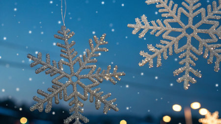 Christmas elegance: snowflakes hanging gracefully on the window, kissed by a gentle glow