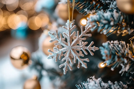 Close-up of sparkling snowflake ornament in silver and blue tones hanging on a pine branch with festive holiday lights glowing softly in the background
