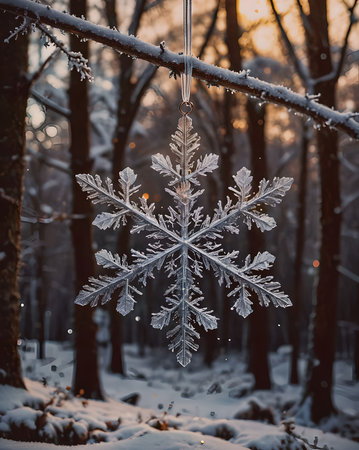 A detailed crystal snowflake ornament hangs from a tree branch, illuminated by soft bokeh lights in a festive atmosphere.