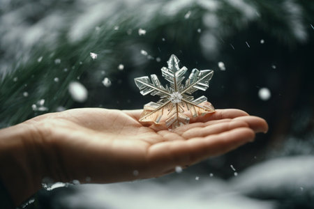 A hand delicately holds a single snowflake, its intricate details visible against a backdrop of falling snow and a blurred, cold environment. The image features soft lighting and a cool color palette. It may be suitable for illustrating concepts related to winter, nature, or seasonal changes, and could be used for various commercial or editorial applications.