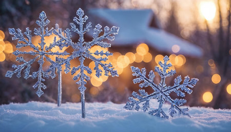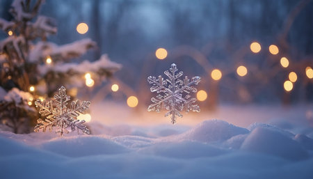 Three intricate crystal snowflakes are nestled in the snow, illuminated by warm bokeh lights and the soft glow of a distant building.