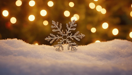 A single, intricately detailed snowflake rests prominently on a bed of soft, white snow. The snowflake's delicate crystalline structure is sharply in focus. Behind it, a warm golden bokeh effect creates a blurred, luminous background, adding a magical and festive ambiance. captures the beauty of winter's delicate formations and evokes a sense of serene holiday magic.