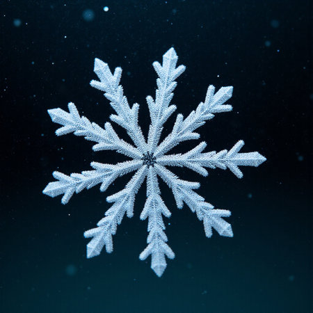 This image showcases a single snowflake with intricate details, set against a dark backdrop. The composition highlights the crystalline structure, with a focus on light and shadow. Potential uses include editorial illustrations, educational materials, and designs related to winter themes or cold weather.