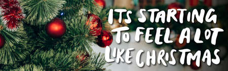 decorated pine branches with red balls near it is starting to feel a lot like christmas lettering, banner