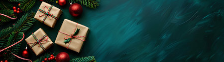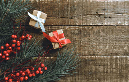 Christmas gifts and fir twigs with decorations on a wooden background. New Year concept, top view, flat lay. Copy space.