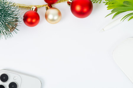A white background with a Christmas tree and red and gold ornaments. A white iPhone is on the left side of the image