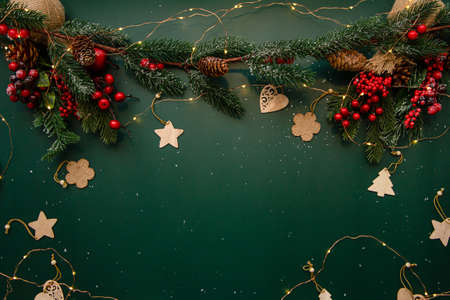 Lush Christmas garland with red berries and golden baubles on a dark green wall background. Copy space. Christmas postcard