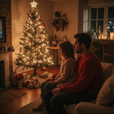 A beautifully decorated Christmas tree with ornaments and lights, surrounded by gifts, set in a cozy home for the Feast of the Nativity