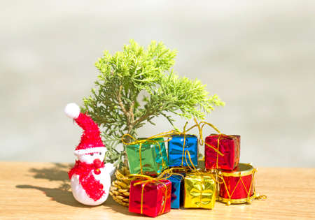 Top view of Christmas composition with tree, gift boxes, snow doll on wooden background and copy space. Accessories of Christmas and new year concept.