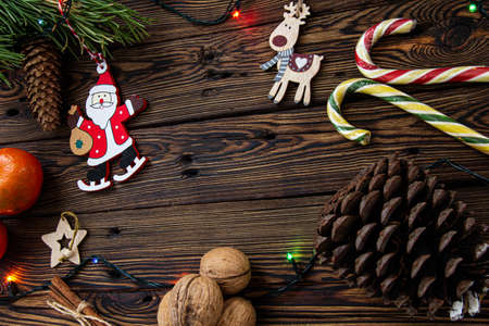 Beautiful christmas frame decoration from peppermint candy cane stick, christmas balls, candle, santa claus decor, fir cones and pinecones at brown wooden background.