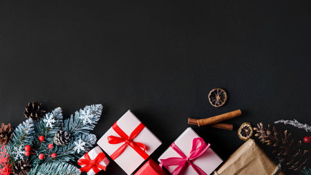 Christmas tree with red decorations and gifts on black background. Flat lay, top view, overhead. Christmas banner mockup.