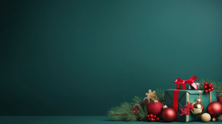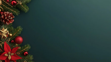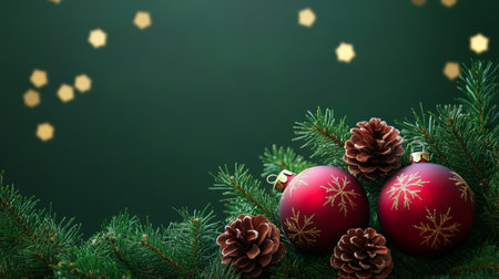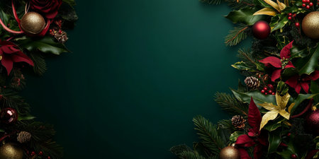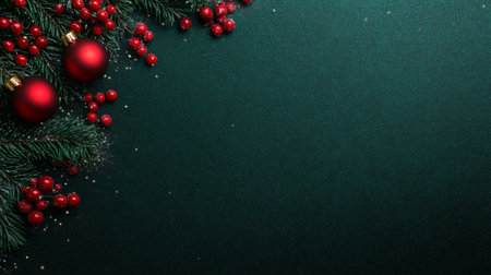 Christmas decorations with red baubles and berries on lush green pine branches. The dark green glittery background adds elegance to the festive composition.