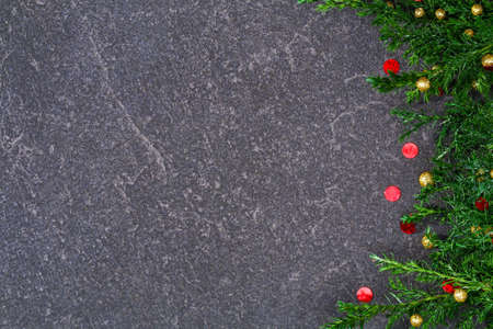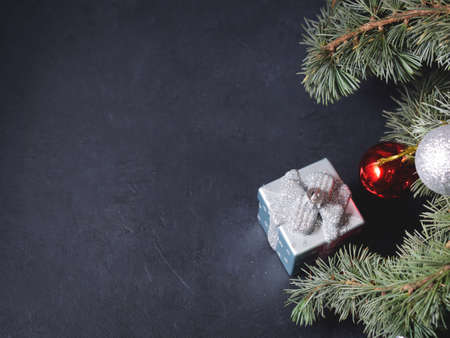 coniferous branches and Christmas tree decorations on a New Year's black background, copy space