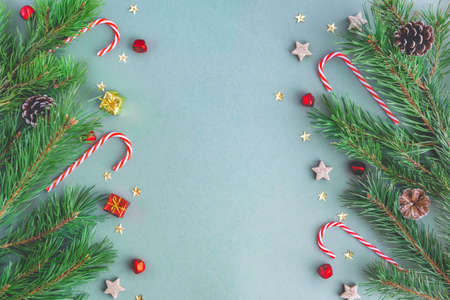 Christmas background from Christmas candies, branches of a Christmas tree, toys, sparkles and stars. Place for your text. Green background. Horizontal orientation.