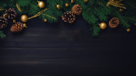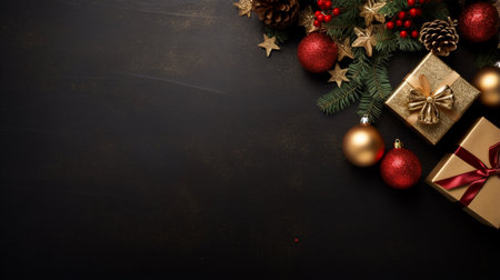 Christmas background with a black wood texture, decorated in a red and gold color scheme with pine cones, gifts, holly berries, stars, ornaments, and spruce branches, with space for text or design, high resolution. --ar 53:30 --v 6.1 Job ID: a89127cc-be87-47d0-b0b3-fff428697289