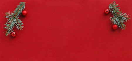 Christmas and New Year background with green fir tree branches and decoration on red background