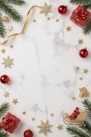 A holiday-themed flat lay featuring evergreen branches, red and gold ornaments, glittery stars, snowflakes, gift boxes, and a golden sleigh with gifts. Set on a white marble surface with a blank center for text, perfect for seasonal greetings or promotional designs.
