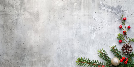 Christmas decoration on concrete background with red berries pinecones and branches holiday decor