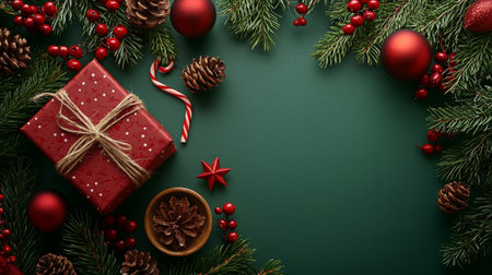A beautifully wrapped red Christmas gift with twine, surrounded by candy canes, pinecones, and festive decorations on a green background.