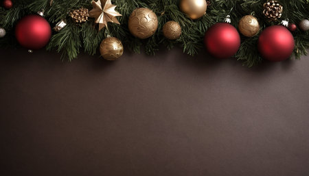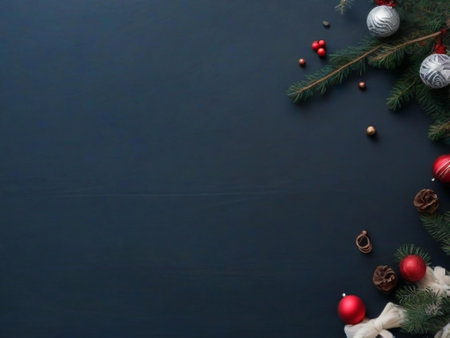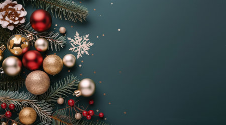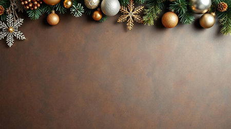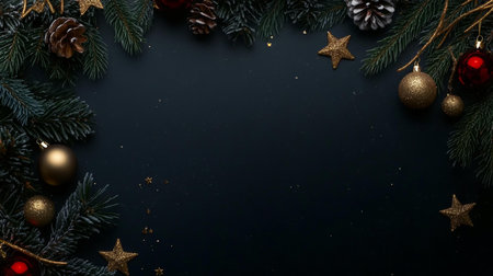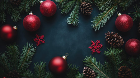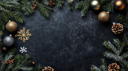 Festive background featuring snowflakes, Christmas baubles, and pine branches on a dark surface, perfect for holiday greetings