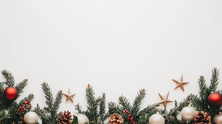Modern holiday backdrop with pine branches and minimal ornaments.