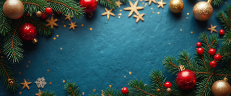 Festive red baubles, gold stars, and green pine branches arranged on a blue background, creating a holiday atmosphere.