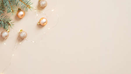 Christmas tree branches, balls and golden garland on pastel beige background. Hygge, cozy, nordic Christmas composition. Minimal style. Flat lay, top view.