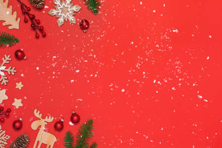 Beautiful Christmas frame with baubles, fir tree and snow on red background. Greeting card, banner. Holiday concept. Flat lay top view, copy space