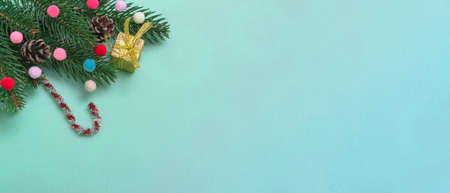 Christmas composition. Gift box Christmas decorations copy space with for your text. Flat lay.Banner